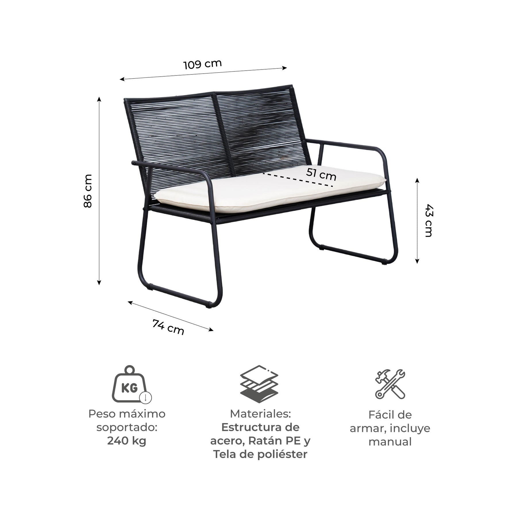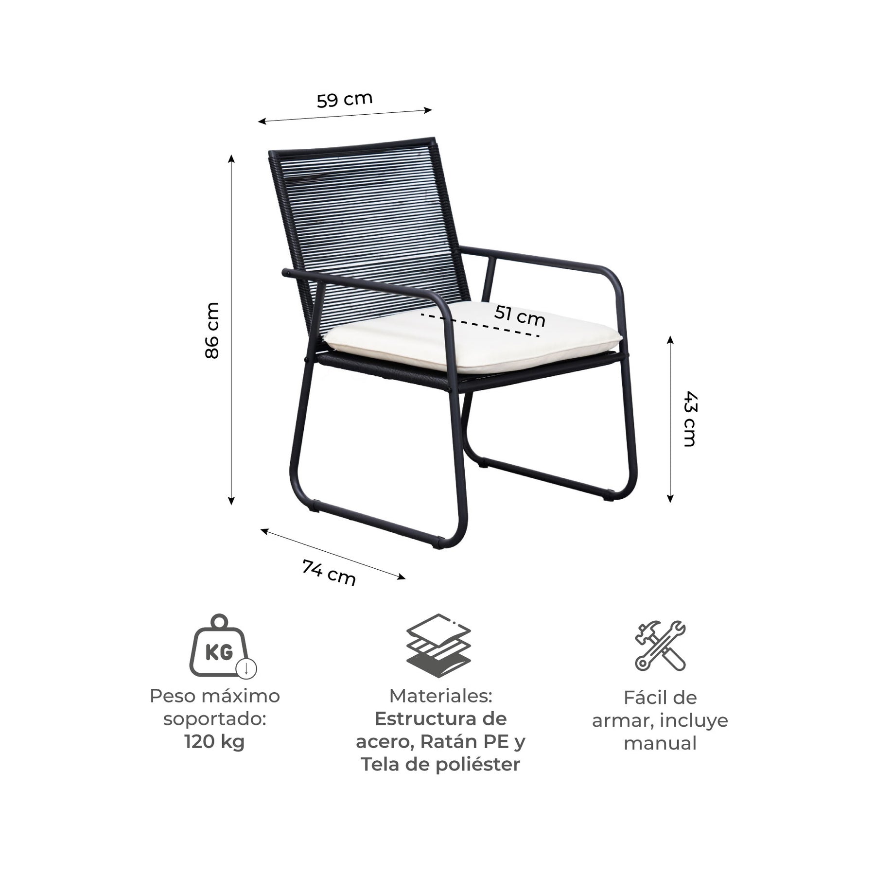 Materiales: Ratán PE, Acero, Tela de poliéster