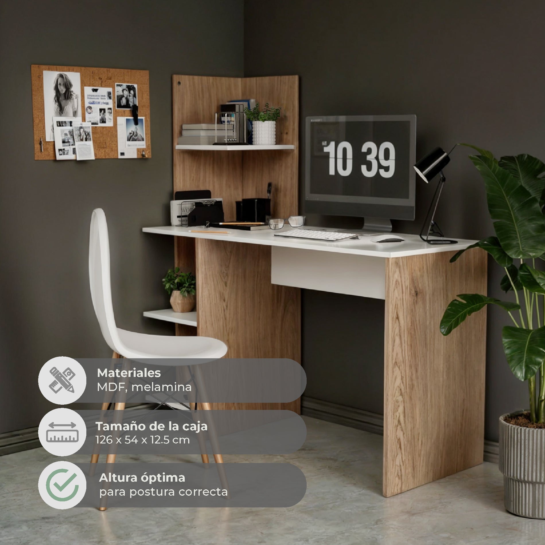 El Escritorio Maple by Top Living es tu aliado perfecto para dale un upgrade a tu espacio de trabajo. Su diseño nórdico, con líneas limpias y acabados que imitan la madera, combina a la perfección estilo y funcionalidad. Además, incluye estantes, ideales para mantener organizados tus libros, documentos, accesorios de oficina o incluso tus objetos decorativos favoritos. ¡Todo al alcance de tu mano mientras trabajás o estudiás!