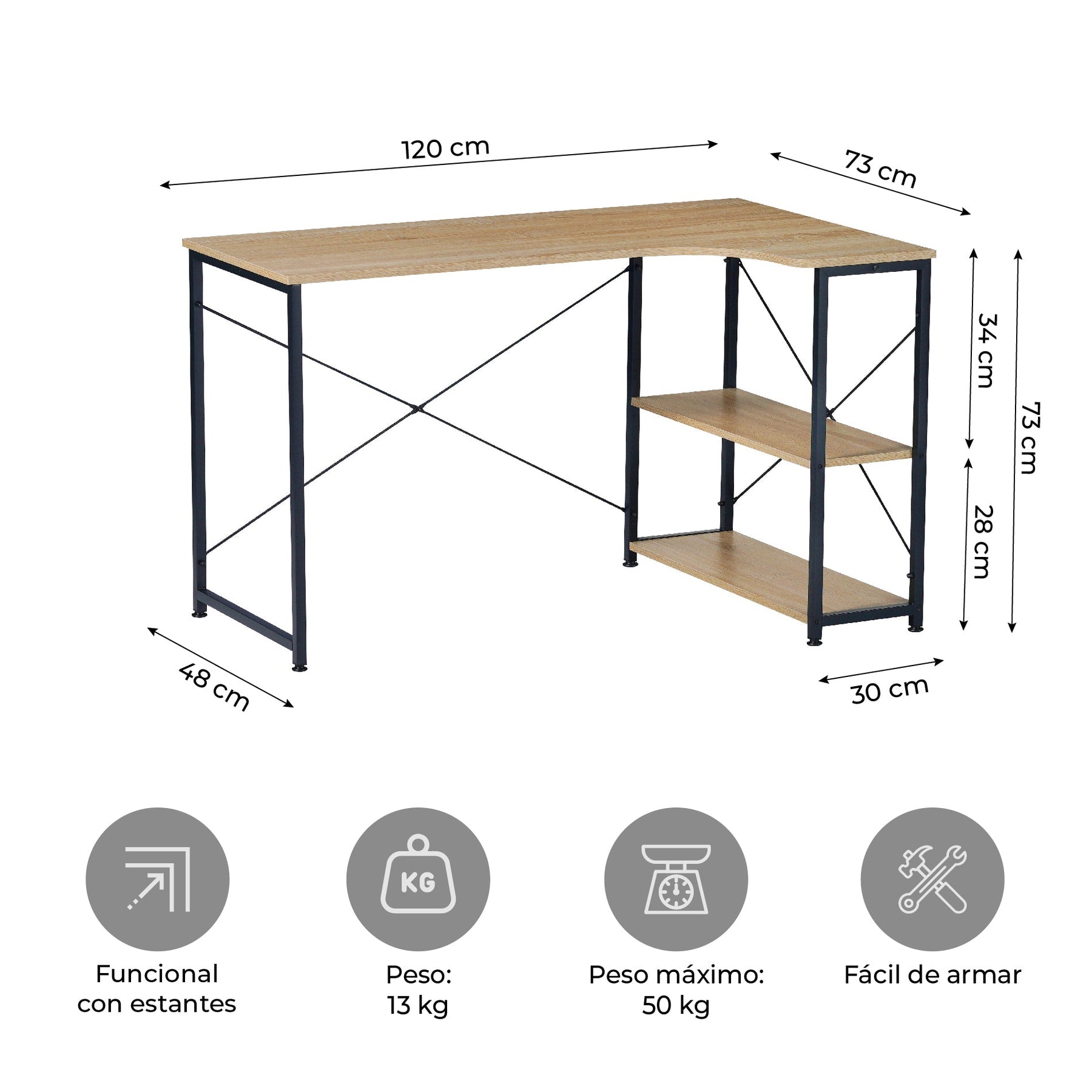 Dimensiones: - Largo: 120 cm - Alto: 73 cm - Ancho: 48 cm / 73 cm (lado con estantes)