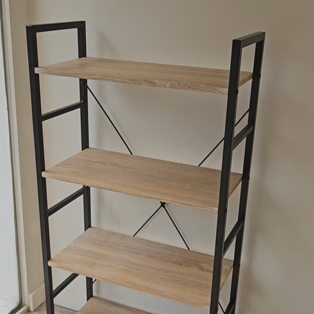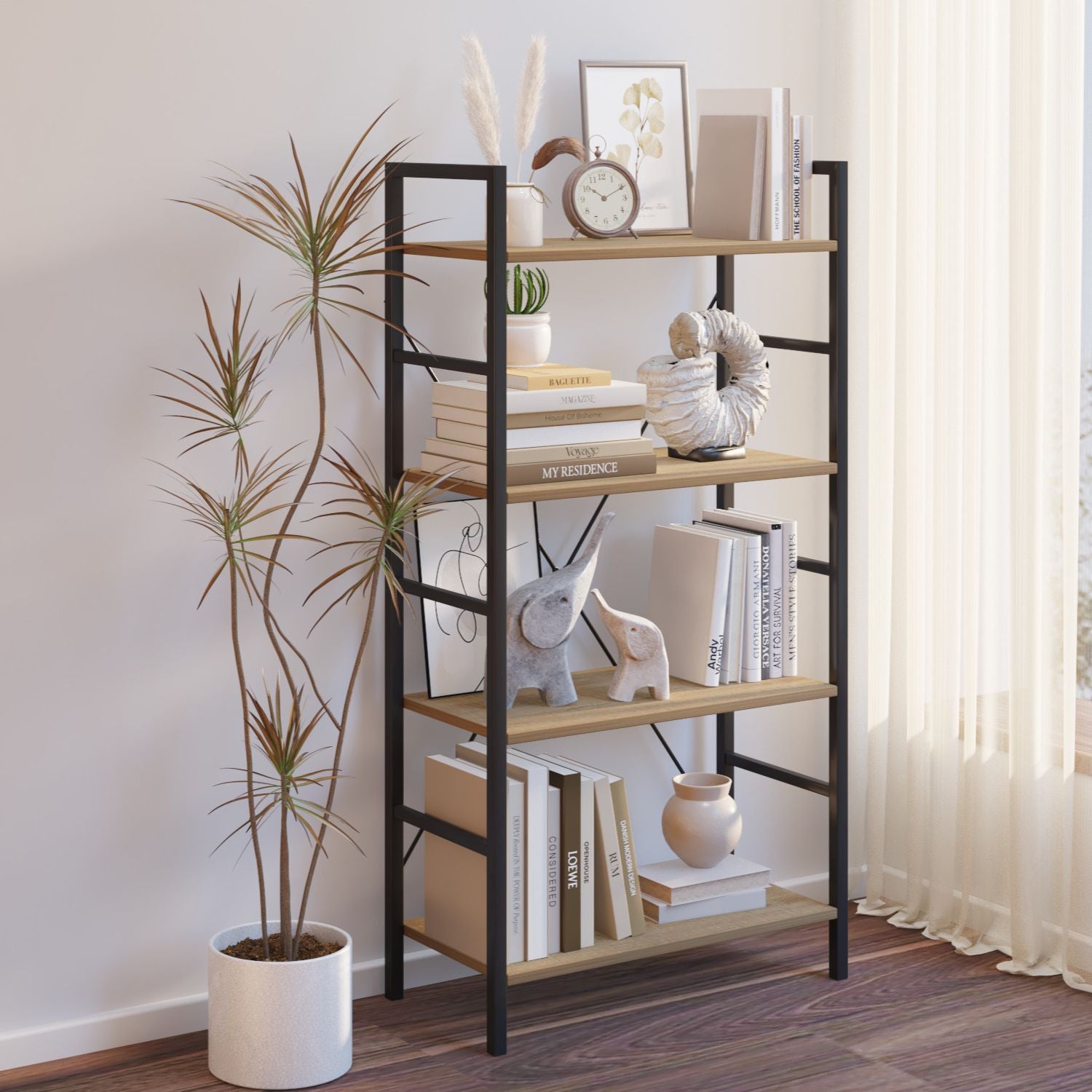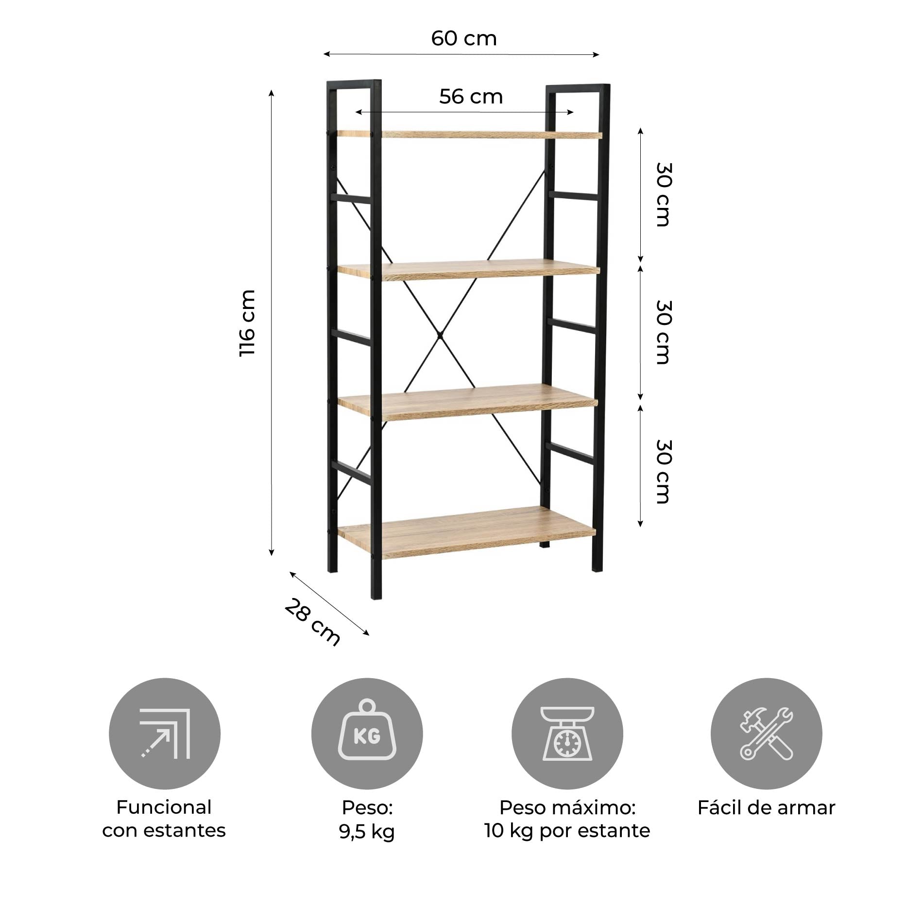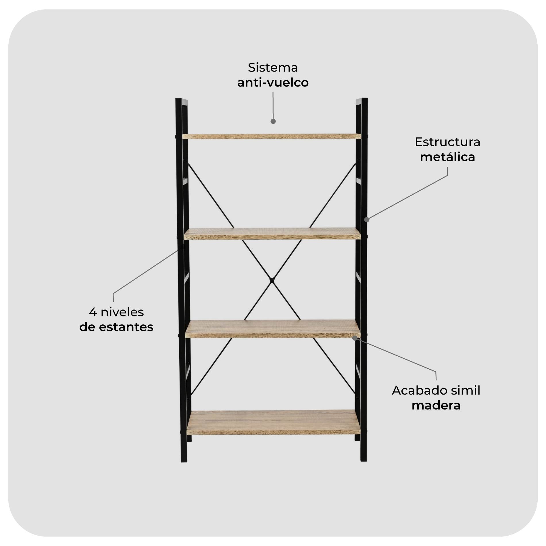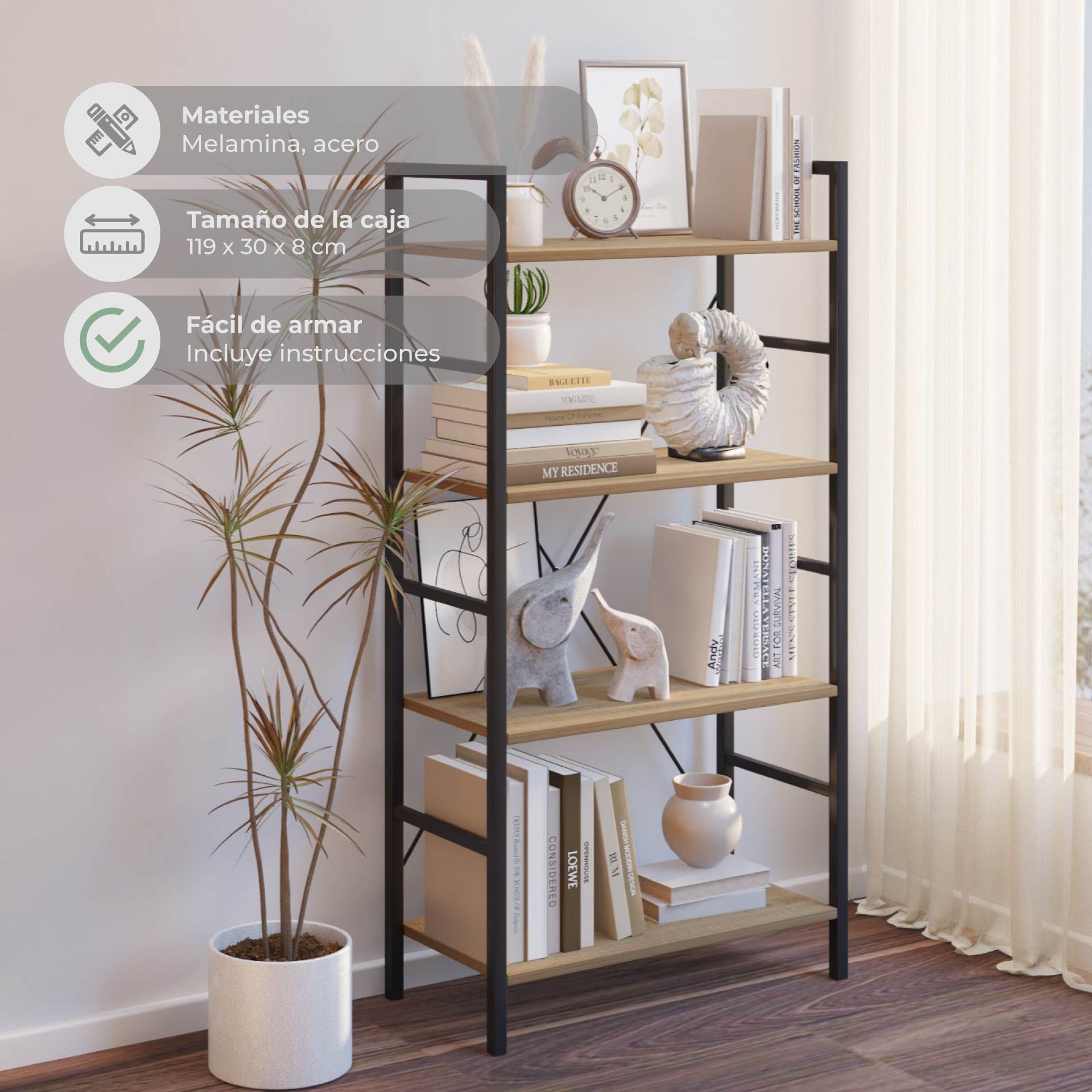 - Con 4 estantes estilo madera natural para colocar todos tus libros, objetos y elementos decorativos.