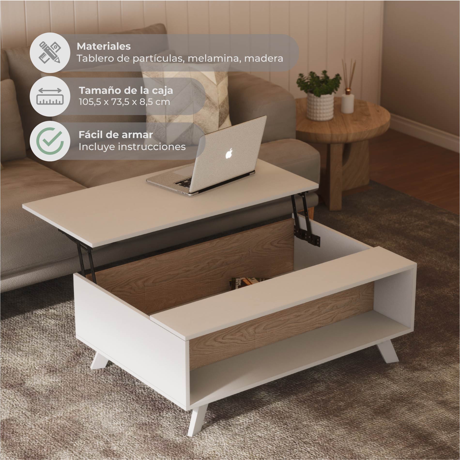 - Espacio de guardado interno, ideal para ordenar y decorar tu living