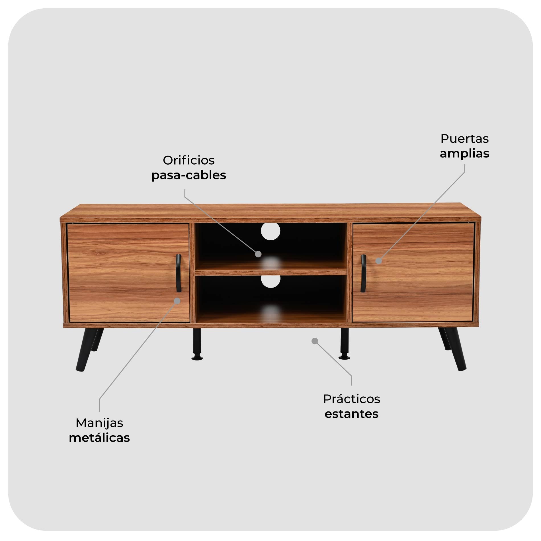 - Con dos orificios pasa-cables para mantener tu espacio ordenado.