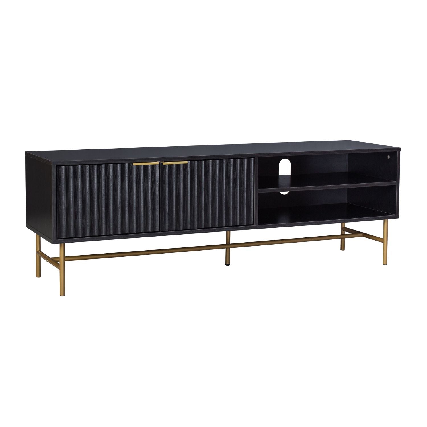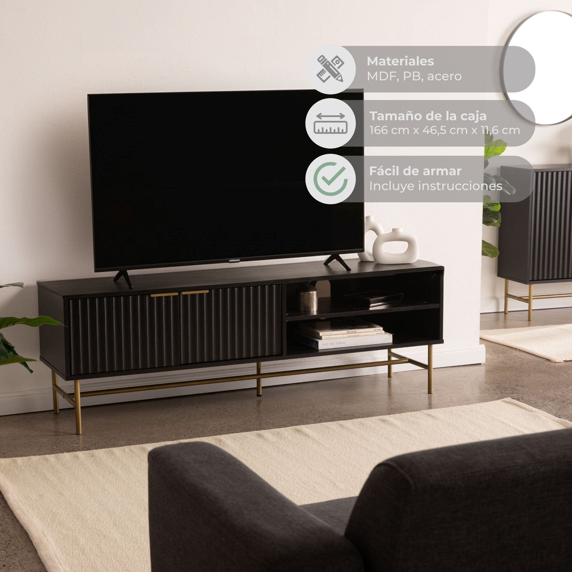 Dale un aspecto elegante a tu hogar con el rack de TV Queens. Su práctico diseño con amplio espacio de almacenamiento combina tonos oscuros con detalles dorados, dando como resultado un mueble contemporáneo que eleva cualquier espacio.