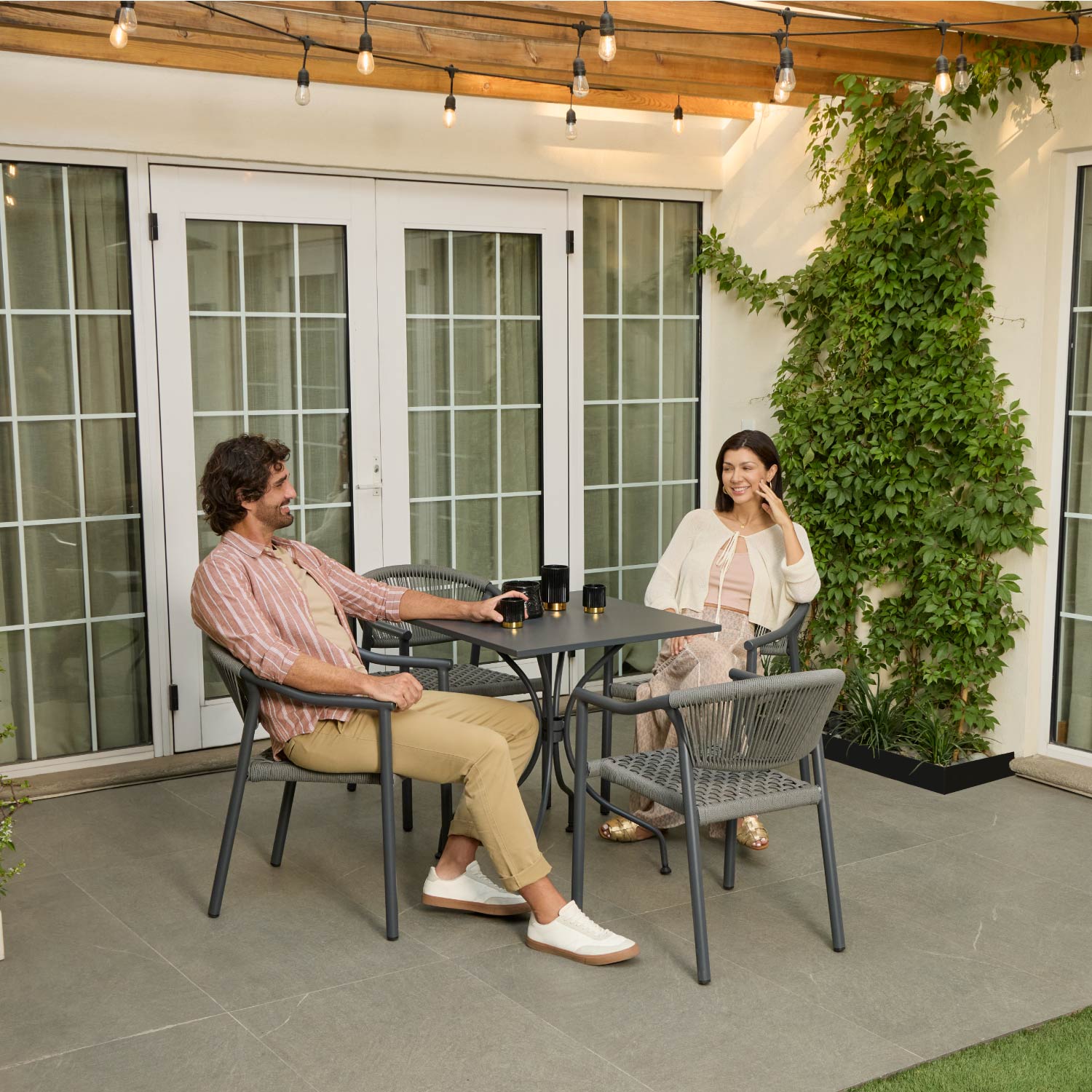 - Apta exterior e interior, sus materiales son resistentes a la intemperie, cuentan con protección UV y resistencia al agua. Podes usarlas tanto en el patio, la terraza o el jardín, como en el comedor o la sala de estar.