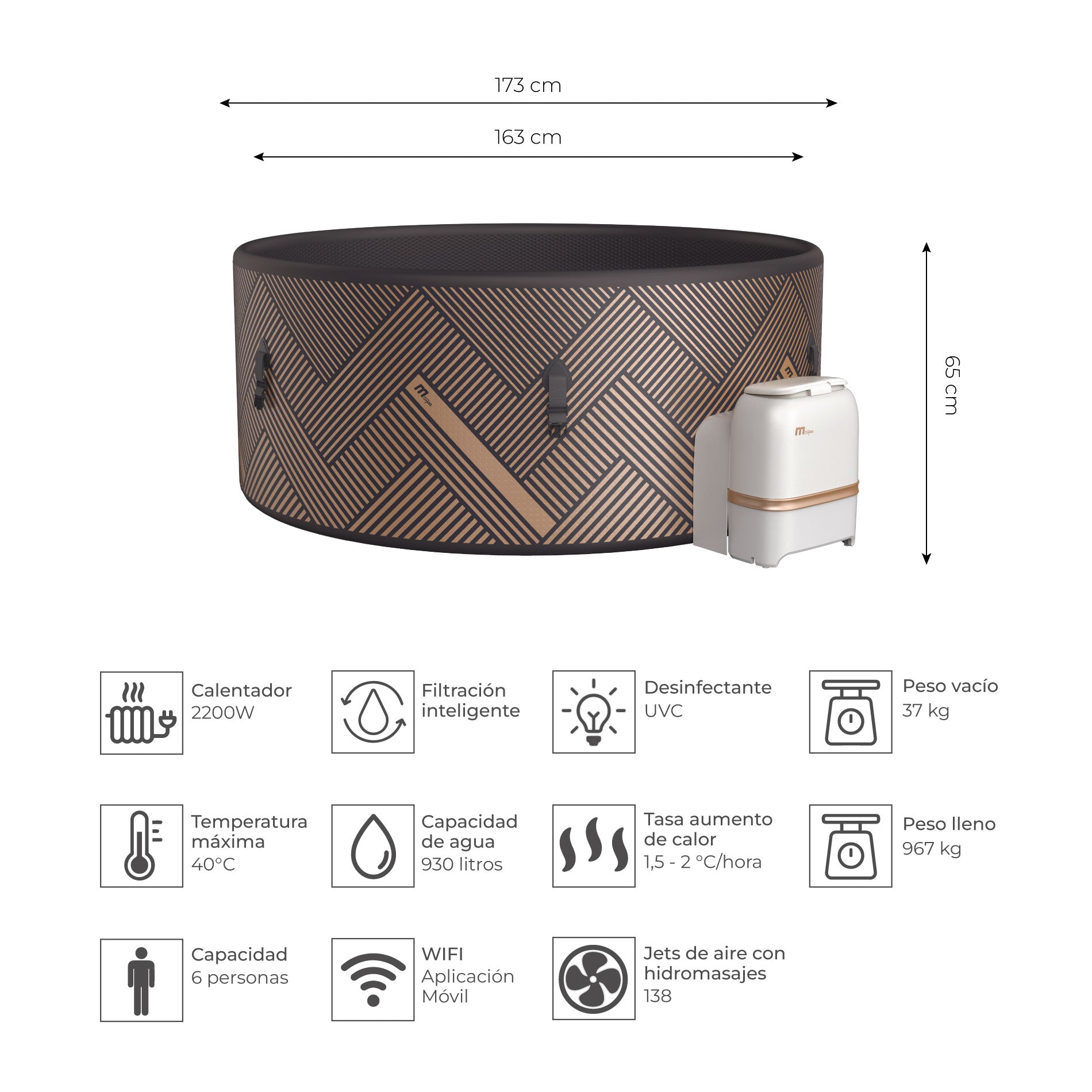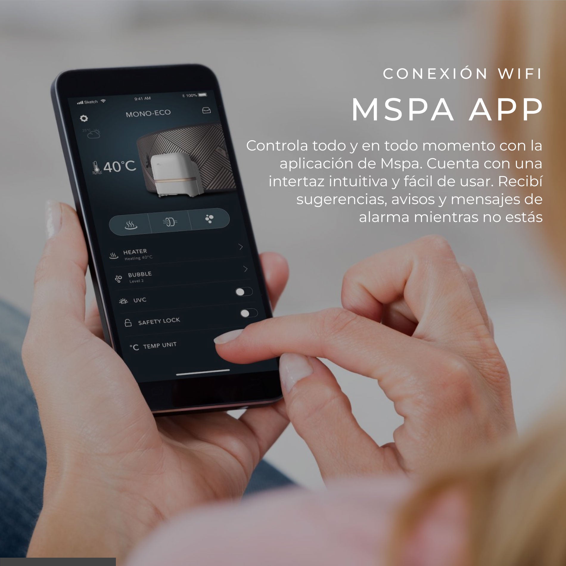 Con las rayas metálicas en la pared exterior texturizada, el Mono Eco Wifi es un modelo super elegante dentro de la linea de hidromasajes inflajes de MSpa. Viví una experiencia de relajación única todos los días en la comodidad de tu hogar.